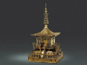 佛塔源于古印度,也称“浮屠”,是用来供奉高僧舍利、经卷和各种法物的一种建筑物。佛塔形制不同,功用各异,其构造由塔座、塔瓶、塔刹和塔顶等四大部分组成。展品鎏金铜浮屠通体鎏金,由宝刹、浮屠、月台、基座组成。浮屠方形基座上有三层月台:最底层方形月台栏杆有宝珠、如意云头、葫芦状装饰物;中间层是四级叠涩月台,栏杆四周中部竖立“望柱”,柱顶有蹲狮;最上层方形月台侧面各有四个桃形壸门,月台上为铜浮屠,进深均为三间,顶似“攒尖顶”,攀间枋、栏额、蜀柱俱全。当心间设门两扇,门外置金刚力士一对。浮屠四周亦设栏板,“攒尖顶”上有须弥座,座上有宝刹。宝刹下端有六枚相轮,相轮上置华盖。盖上有十字相交的火焰背光,其上有双轮新月与日轮,刹尖高耸,最上为摩尼珠。