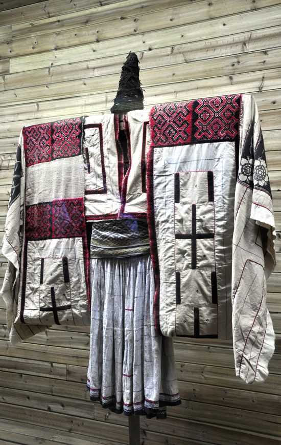 昭通市鲁甸县苗族支系“大花苗”女子传统服饰。椎髻,上为白布绣花交领宽袖衣,以蜡染织锦装饰,衣服上的“田”字花纹形似田地、谷穗;系织锦腰带;下为麻布百褶裙,裙边施以蜡染,裙上三条纹线代表苗族祖先从北向南的迁徙路线。苗族服饰被誉为“穿在身上的历史”,此套苗服保留了“椎髻斑衣”的古制,风格质朴古拙,具有较高的麻纺织工艺水平。