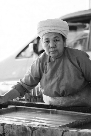云南耿马傣族自治县孟定镇芒团村制作构纸的傣族老大妈