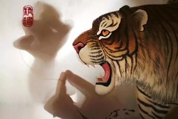 本幅绣品首次成功地将人物肖像图方式引入传统走兽刺绣之中。作者用细腻的针法细致精准地绣出了老虎根根可辨的绒毛和少女光滑细腻的皮肤,形成极大的反差,极具视觉冲击力。