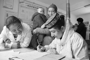 阿特加依里村卫生室的医务人员为儿童做健康记录。 段敏夫 摄