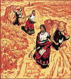 优秀的艺术作品不仅要“说事”,也要“谈美”。西藏各族人民翻身做主人后,精神面貌焕然一新,《初踏黄金路》立足这一重要的时代背景,抽丝剥茧般、一层一层向美的深处挖掘。画家李焕民在这幅作品中,将客观物象与木刻语言进行转换,将体认和思考融于作品创作,营造了浑厚和辽远之美、富饶和力量之美。画面最前方的妇女将一只袖子洒脱地搭在肩上,另一只手牵着牦牛。后面的妇女更为活泼,将外衣围在腰间,发丝在风中飘扬。二人昂首挺胸、毫不羞怯,肢体自由舒展、步伐肆意潇洒,焕发着新时代女性吃苦耐劳、坚强勇敢、乐观向上的光辉。作为参与劳动的个体,画家淡化她们的身份和性别,突出表现她们翻身作主、自食其力,成为新中国平等自由的劳动者的一面,赋予她们的是力量之美,是崇高的、圣洁的人性之美。