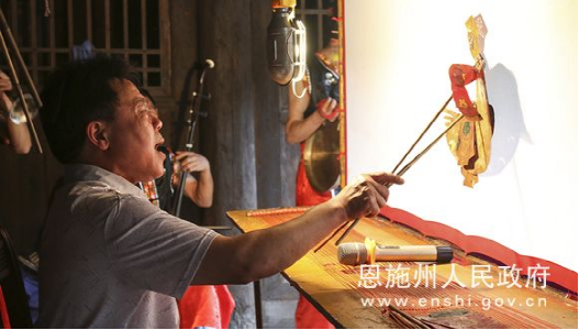 2018年6月10日,省非物质文化遗产鹤峰满堂音传承人彭文照正在表演满堂音皮影戏。